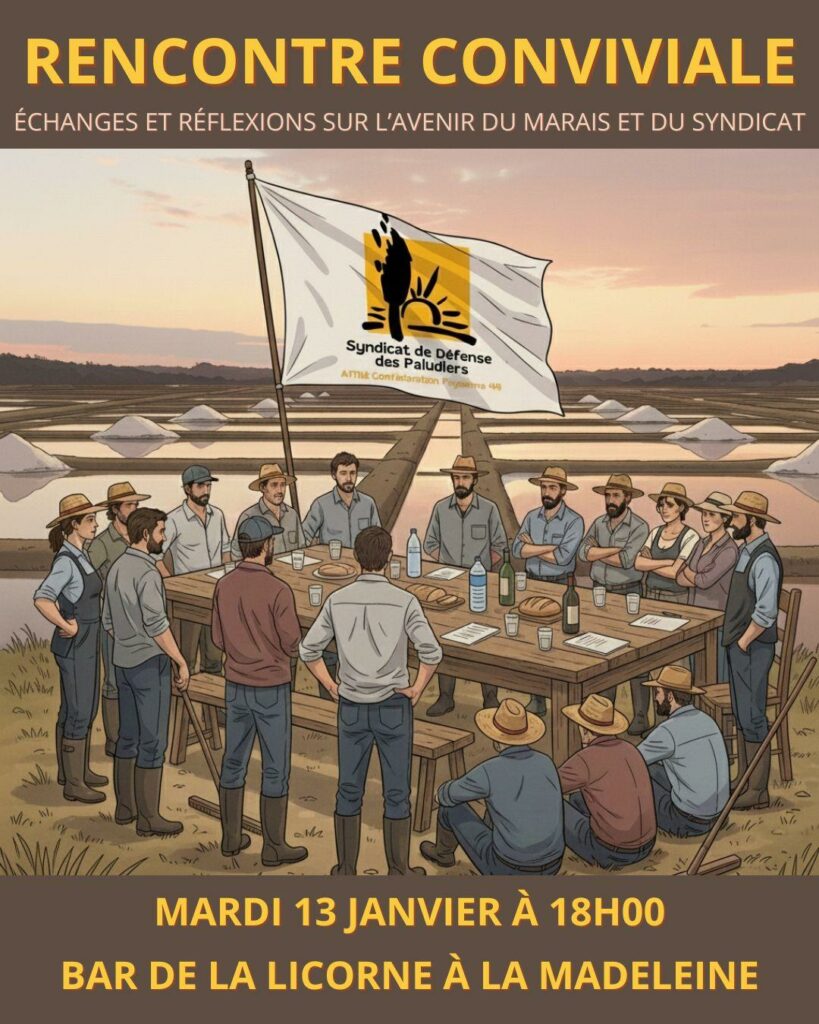 Afin de préparer l’assemblée générale ensemble, le Syndicat de Défense des Paludiers vous invite à une soirée d’échanges et de réflexion conviviale au Bar de la Licorne à la Madeleine le Mardi 13 janvier à 18h00.